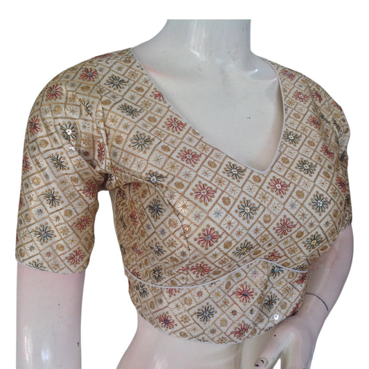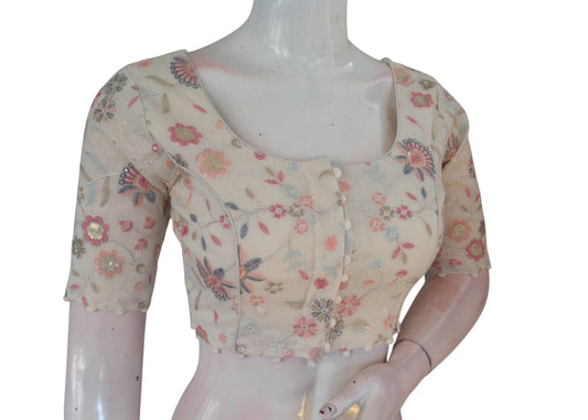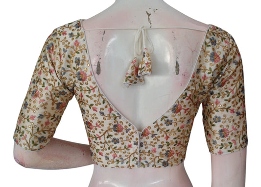 Designer Off-White Floral Embroidery Readymade Saree Blouse - Semi-Silk