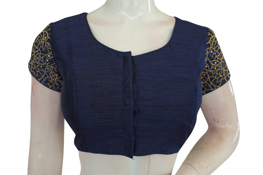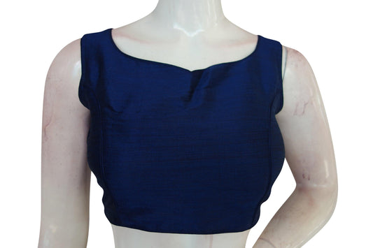 Midnight Elegance, Navy Blue Plain Semi Silk Designer Readymade Saree Blouse