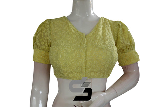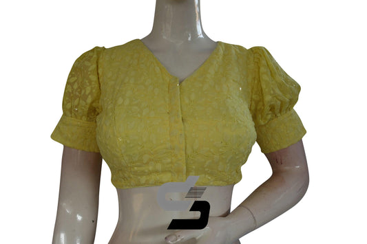 Sunny Charm: High Neck Chikankari Saree Blouse with Puff Sleeves in Yellow