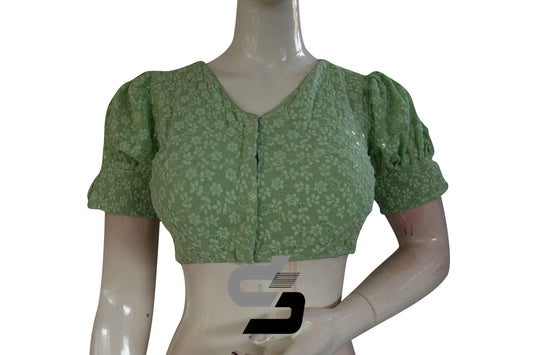 Spring Serenity: Pastel Green High Neck Chikankari Saree Blouse with Puff Sleeves