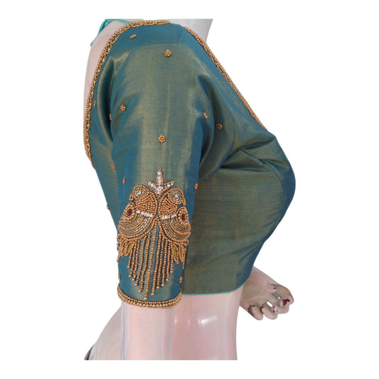 Elegant Teal Green Aari Handwork Tissue Silk Wedding Blouse - D3 Blouses