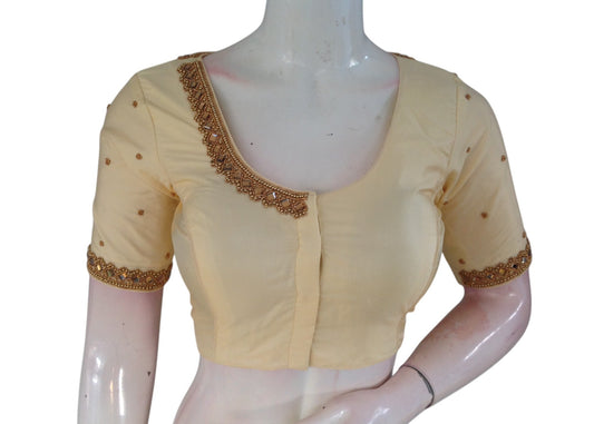 Ivory Radiance: Mirror Aari Handwork Bridal Silk Saree Readymade Blouse