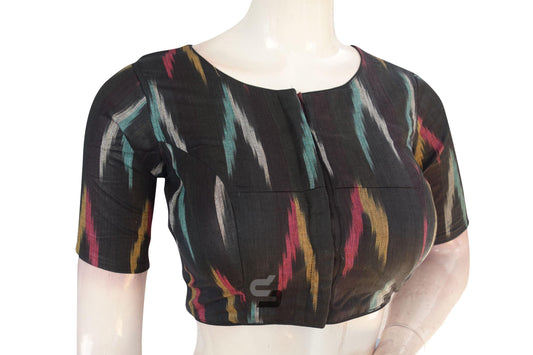 Elegant Black Ikkat Highneck Saree Blouse, Designer Women's Wear