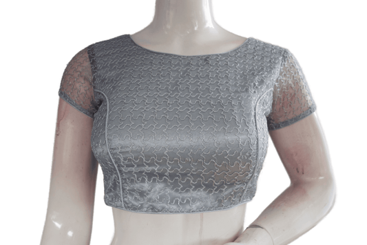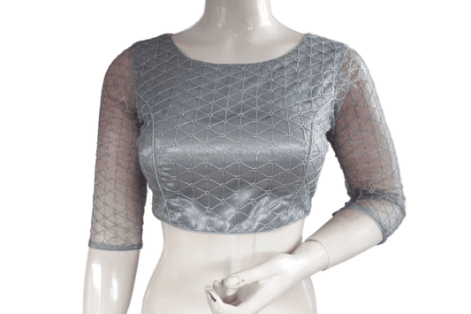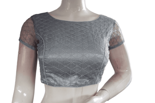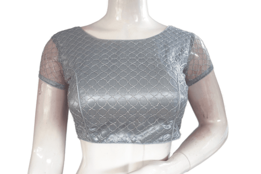 Grey Color Boat Neck Designer Embroidery Netted Readymade Saree Blouse