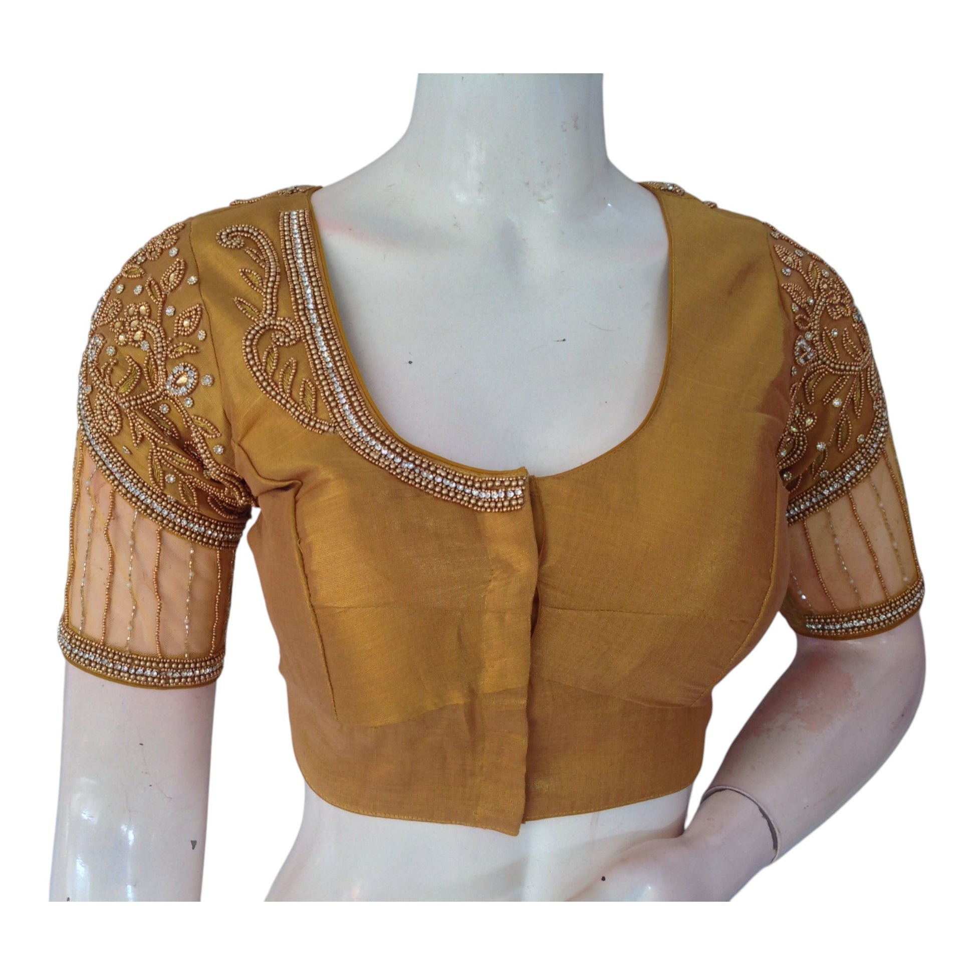 Admire this stunning gold tissue blouse featuring elaborate aari handwork. The detailed embroidery showcases exceptional craftsmanship, perfect for weddings and special occasions.